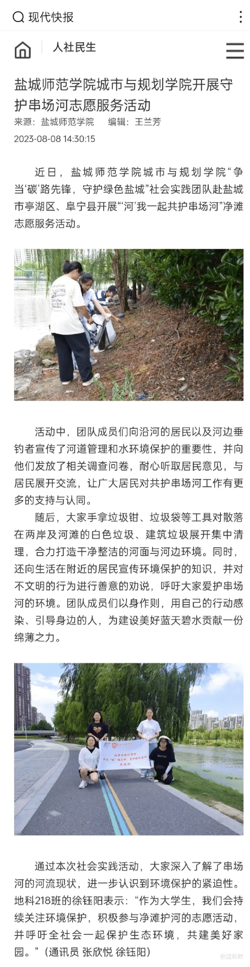 8月8日,现代快报报道了城市与规划学院“争当‘碳’路先锋,守护绿色盐城”实践团的暑期社会实践活动。