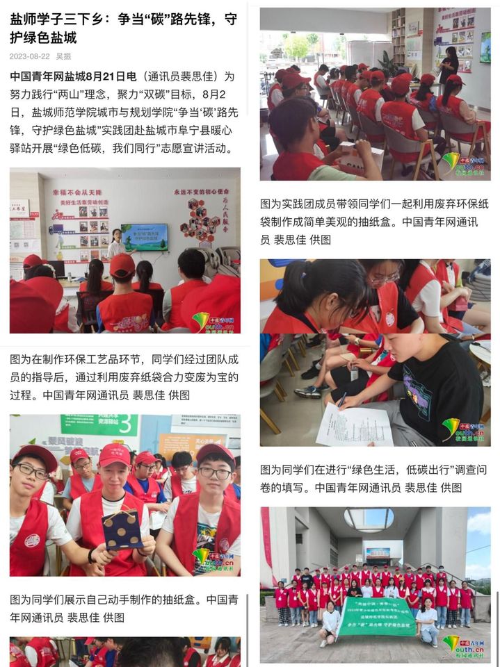 8月22日,中国青年网(中青校园)报道了城市与规划学院“争当‘碳’路先锋,守护绿色盐城”实践团的暑期社会实践活动。
