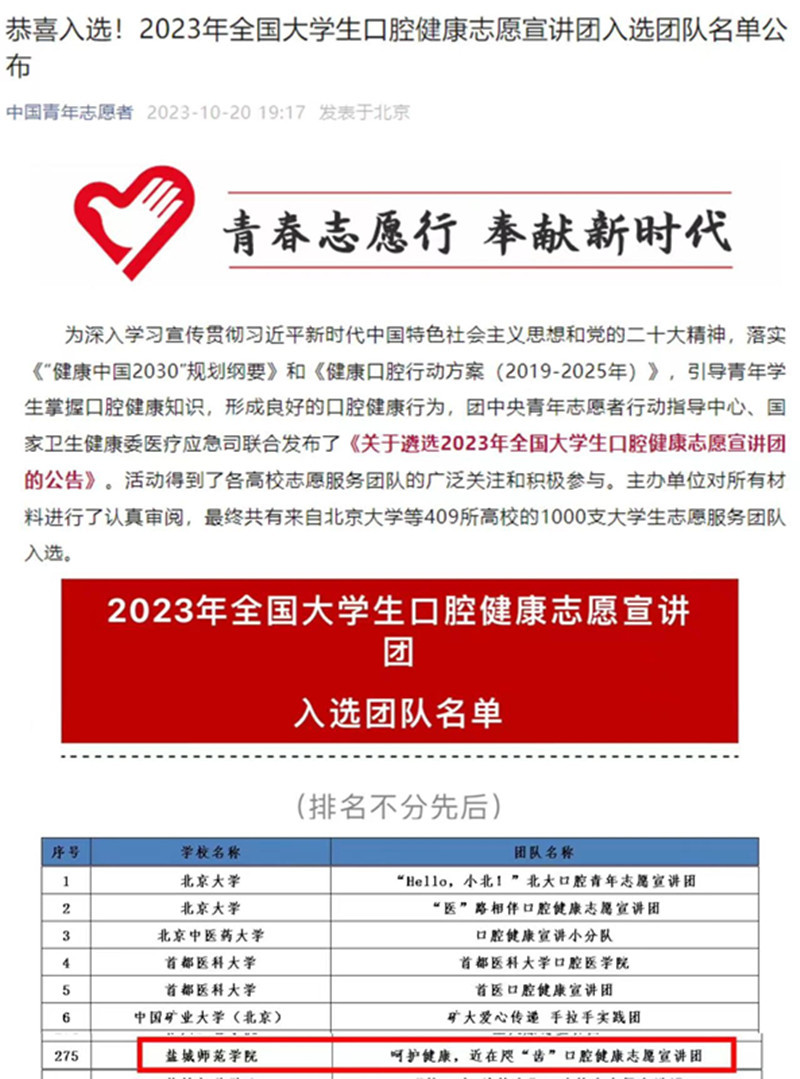 近日,由团中央青年志愿者行动指导中心、国家卫生健康委医疗应急司主办,中南大学湘雅口腔医院、中国青年志愿者协会秘书处承办的2023年全国老员工口腔志愿宣讲团遴选活动圆满落幕,遴选出来自409所高校的1000支老员工志愿服务团队,公司“呵护健康,近在咫‘齿’”志愿宣讲团成功入选。