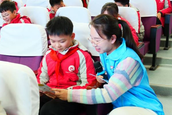 活动中,宣讲团成员面向六年级同学发放口腔健康宣传册,开展集中宣讲。“我们一天需要刷几次牙?龋齿有什么危害?几岁开始换牙?正确的刷牙方法应当上下转动刷,咬合面来回刷,里外都要刷干净……”。宣讲成员详细展示了牙齿的结构、作用,介绍了爱护牙齿的重要性以及正确的刷牙方式和牙线的使用方法,并邀请小朋友上台进行现场刷牙,充分激发了孩子们对牙齿的好奇心和对刷牙的兴趣。“我一定要好好刷牙,早晚两次,保护牙齿,不长蛀牙!”在现场互动环节中,同学们小手举得高高的,争先恐后地回答各个问题。主讲成员带领同学们齐声诵读了牙膏选择的诗歌,让同学们对保护口腔健康有了更全面深入的认识。