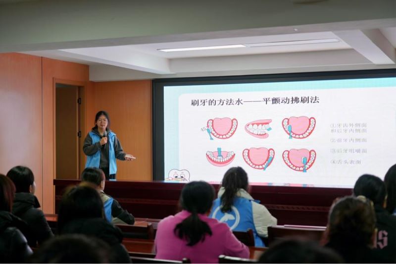 活动中,主讲人张乐围绕龋齿、牙周炎的形成原因,口腔溃疡的治疗,老年人怎样爱护义齿等事项展开讲解,宣传了爱牙、护牙的重要性,强调要正确掌握护牙、刷牙的方法并定期到医院清洗牙齿,呼吁大家养成早晚刷牙、睡前刷牙后不进食,帮助居民养成良好的口腔卫生习惯。同时,志愿者们还介绍了正确的刷牙方法(巴氏刷牙法)并进行演示。活动现场,观众们认真聆听,并积极与志愿者就口腔问题展开交流讨论。