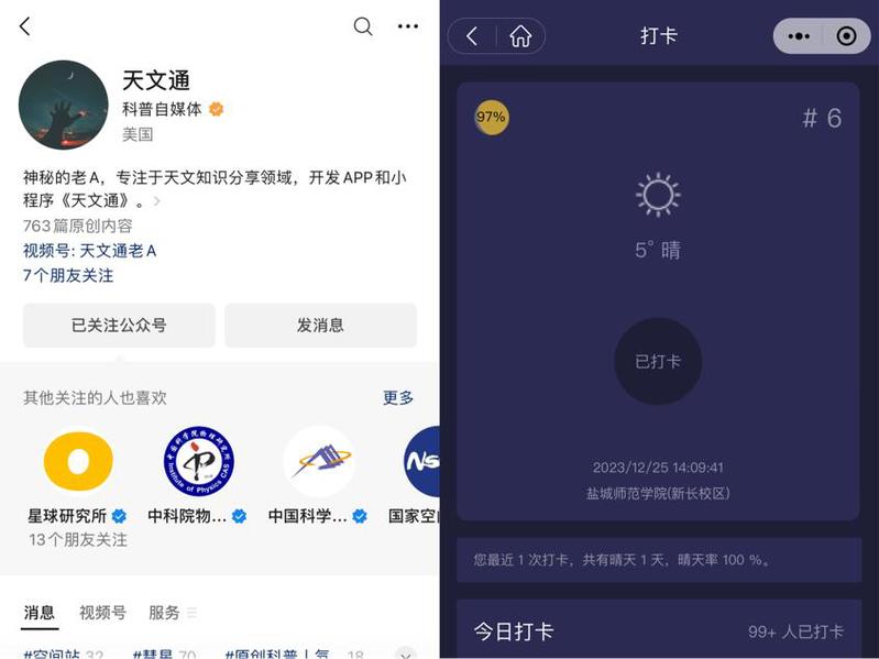 活动过程中,宋子文通过线上的方式先向同学们讲解了有关天文地理的知识,带领同学们了解不同天文现象的产生原因及其观测的方法。同学们热情高涨,纷纷投入到这场天文盛宴中,积极参与线上讨论,分享美妙的天文景象和学习心得,力求成为一名懂天文、爱天文的传播者。经宋子文同学的推荐,同学们还自行关注“天文通”公众号进行学习打卡,对天文现象的感受更加深刻。来自人文237班的陈思蓉同学表示:“此次活动让我感受到了天文学的魅力,激发了我对宇宙探索的兴趣,并且让我掌握了相关的天文知识,丰富了我的课余生活。”