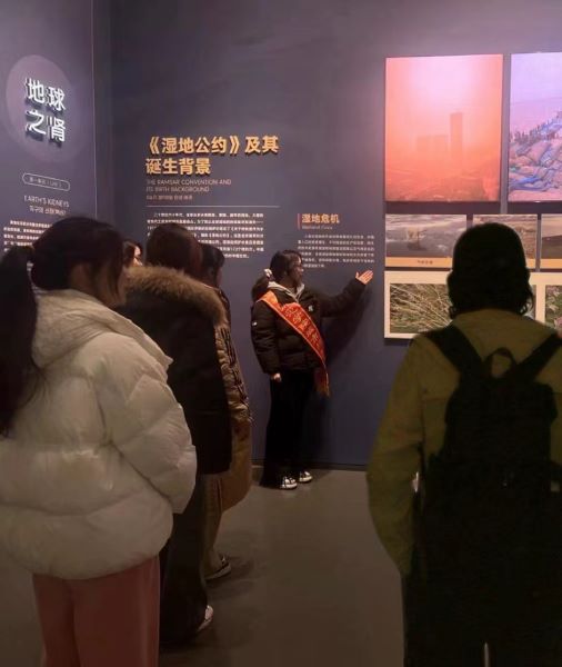 活动中,志愿者们是导览员,为游客指引展馆顺序和路线;是讲解员,带领游客们一同了解湿地的类型、生物的多样性、湿地和文化的传承等等,运用通俗易懂、丰富生动的语言让游客体会到湿地环境的奥秘;是安全秩序维护员,在扶梯口提醒来往游客注意脚下安全,在观展途中提醒游客请勿触碰馆内藏品,提倡文明观展。