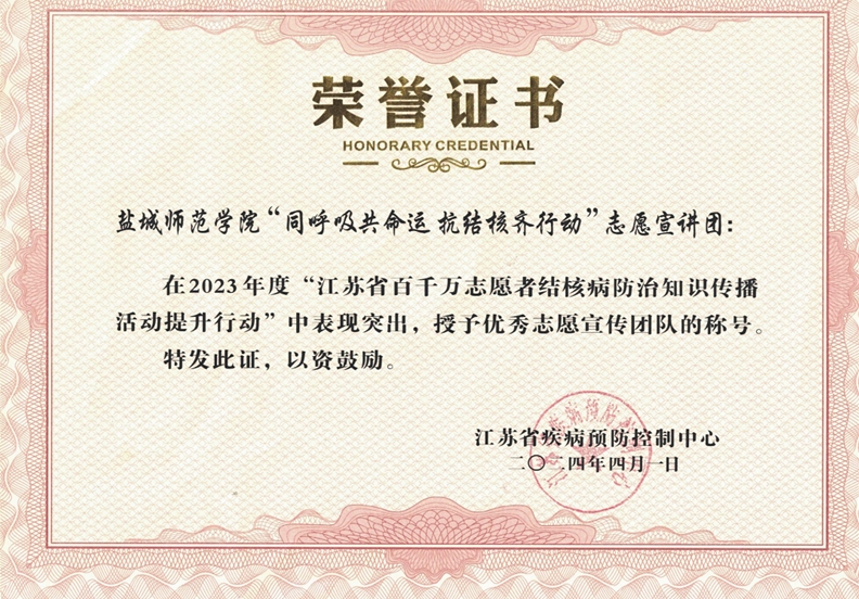 近日,2023年度百千万志愿者结核病防治知识传播活动提升行动推选结果揭晓。公司城市与规划学院“同呼吸共命运 抗结核齐行动”志愿宣讲团获全国结核病防治知识传播活动优秀志愿宣传团队、江苏省结核病防治知识传播活动优秀志愿宣传团队,这是团队继去年入选团中央全国老员工“防治结核 志愿有我”志愿宣讲团,获评全国老员工暑期实践团队TOP100、教育部中国老员工在线“大我青春”暑期社会实践成果征集展示活动实践风采类优秀作品后再获殊荣。