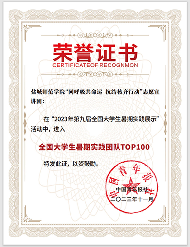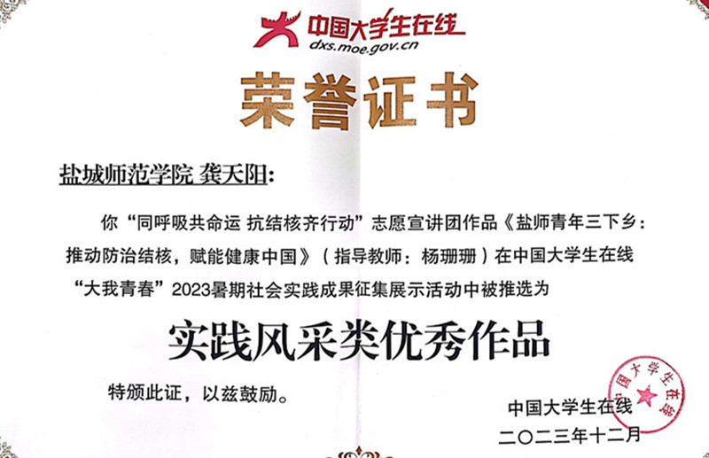 截至目前,实践团已奔赴江苏各地开展30余场“防治结核”志愿宣讲活动,联合盐城市疾控中心、校卫生所等开展健康专题讲座,参加盐城市结核病百千万志愿者培训班,致力于加强防治结核等基本公共卫生服务宣传,推动防治结核,赋能健康中国。《中国共青团杂志》《团学苏刊》《中国青年网》《盐阜大众报》《南通发布》等20余家主流媒体对实践活动进行了专题报道。