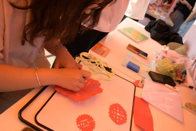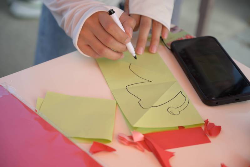 活动过程中,同学们以剪刀为画笔,以彩纸为画布,尽情挥洒自己心中所想。或是活泼可爱的兔子,或是翩然起舞的蝴蝶,一个个生动的图案跃然纸上。接着,通过做好的剪纸进行装饰,寻一处校园美景,用相机拍摄,记录美好瞬间。最后,大家聚集在一起,互相展示自己的作品,交流创作心得,闲谈生活趣事,在留言板上写下未来展望。参与活动的徐源同学说道:“参加这次剪纸活动后,我不仅体验到了传统文化的魅力,还在与同学们的交流中感受到夏日的热情和友谊的美好,受益颇多。”