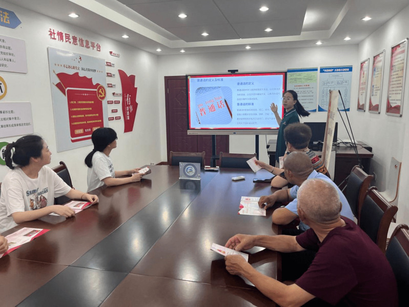 在常州市金坛博物馆,实践团成员吕贝在“返家乡”岗位上,面向博物馆讲解员开展“一对一”推普培训提升普通话水平,一起探讨普通话推广与金坛文化传承的联系,鼓励面向外地参观者时采用普通话与方言结合的形式讲述家乡文化。在学习互动中,她系统了解金坛的历史沿革、人文风俗与金坛三星村遗址文化,透过历史一隅窥见中华民族深厚的文化底蕴和深沉的文化基因。在盐城市省级青少年网球训练中心,实践团成员黄亦向前往训练的网球队员与当地群众宣传推广普通话,她详细阐述了普通话作为中华民族语言纽带的重要意义,并结合实际案例深入浅出地分析了普通话在日常生活、工作和学习中的广泛应用。此外,“返家乡”实习岗位上的成员们积极推动自己的暑期实习地点设立“语言角”,为工作人员和来访群众提供自由练习普通话的空间。