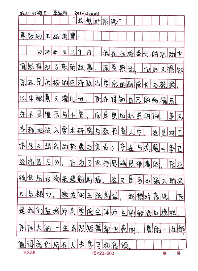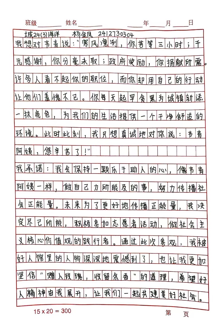 参观过后,特别设置了感恩互动环节。“我想对您说”的温馨时刻里,海洋244班李筱雅同学将王强老师视为灯塔与楷模,誓言要将这份光芒薪火相传,让王强老师的精神成为激励自己前行的不竭动力。而“我承诺”环节中,海洋243班杨金凤同学则坚定地表示,要以韦青阿姨为镜,将诚信与助人为乐融会贯通,用实际行动播撒爱心,让社会因自己的存在而更加温暖如春。