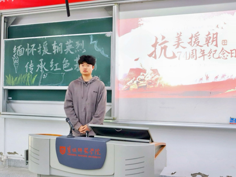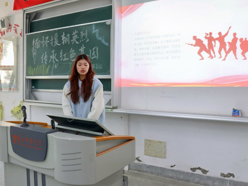 同学们积极响应此次活动,纷纷报名参与。有多名同学主动报名上台充当讲解员,分享自己所了解的英烈事迹。台下的同学认真倾听英烈们的故事,当听到英烈在关键时刻挺身而出,不顾个人安危的壮举时,同学们的眼中闪烁着敬佩和感动的光芒。在分享的最后,同学们一起观看了抗美援朝相关影像,他们紧盯荧幕,表情认真而专注。