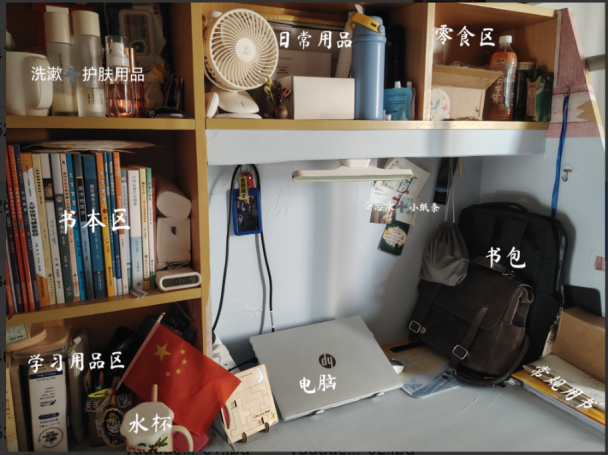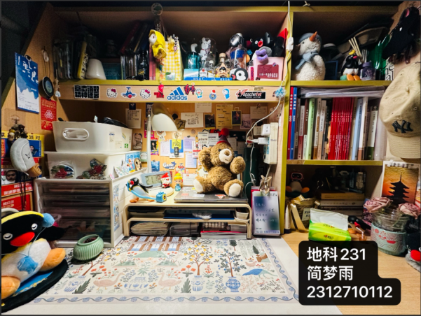 本次活动要求参与同学书桌干净整洁,将各类东西分区放置并通过拍照的方式展现书桌独特的风格和特色,用独特的色彩、创意的摆件丰富着自己的一方天地,展现出自己多姿多彩的生活,营造了一个舒服的学习环境。在提交的作品中,有的充满仪式感,有的堆满书籍,有的简洁明了,地科231班简梦雨表示“书桌是不仅是学习的伙伴,更是成长的见证者。”