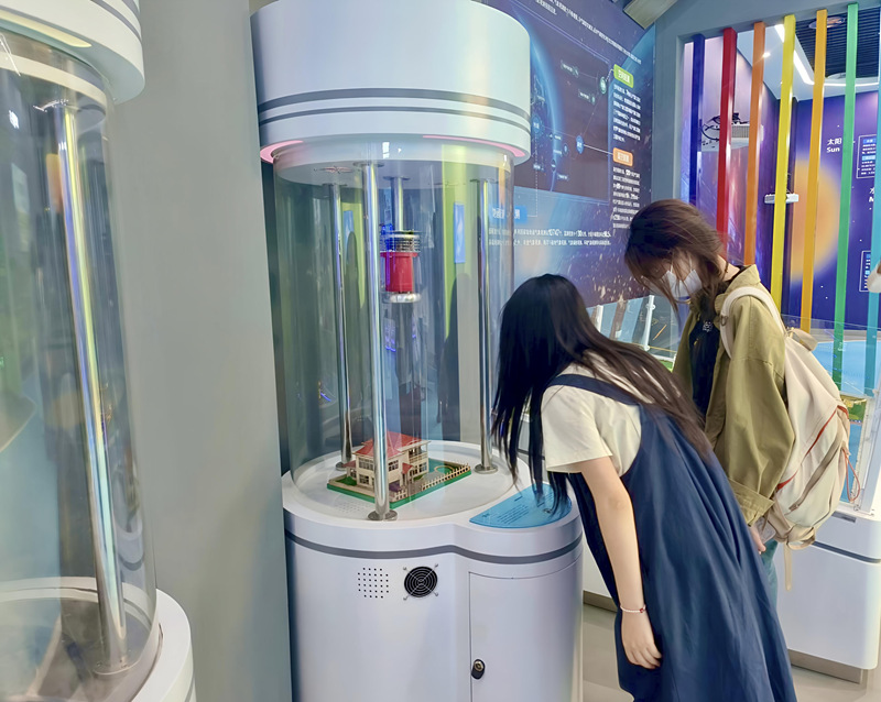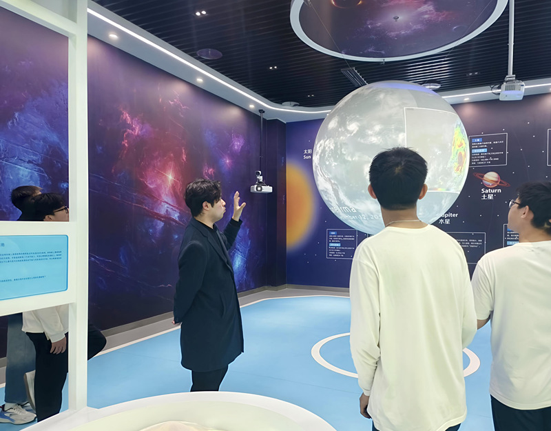 活动中,同学们在讲解员的带领下深入了解了盐城气象站的设备构成与功能。从提供电力保障的电源箱,到监测湿度、风速、风向的传感器,再到百叶箱、雨量器等专业设备,每一件仪器都蕴含着科学智慧。气象科普馆通过图文并茂的形式,向同学们展示了气象发展的三个阶段及盐城气候之最。随后,VR体验区模拟暴雨、台风等极端天气,让同学们直观感受自然灾害的威力,同时提升应对能力。此外,风雨雷电柱、虚拟演播室等互动装置将抽象的科学理论转化为生动的实践体验,让同学们在趣味体验中掌握原理。海洋244班刘思沅同学表示:“这次活动让我认识到气象科学不仅关乎天气预报,更是生态保护的重要一环,希望未来能为应对气候变化贡献自己的力量。”