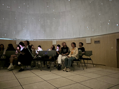 活动伊始,讲解员带领同学们参观了天象馆的星空投影展区,通过逼真的星空模拟,让大家直观了解各类星座分布和天体运行规律。随后,在社团成员的指导下,同学们以英语书写的形式,分享对宇宙的思考、天文知识的理解或深空探索的憧憬。现场讨论声此起彼伏,创作灵感迸发激荡,同学们沉浸于神秘太空的探索中。最后,工作人员贴心地设置了留言板,让每位参与者的“星语心愿”汇聚成跨越时空与天文的“精神星云”。