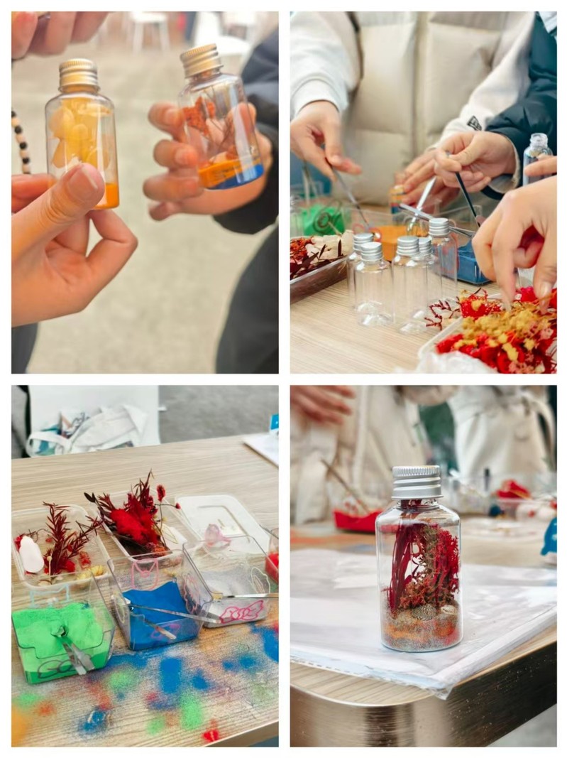 活动结合学院海洋文化特色,将心理学理念与海洋意象深度融合,创新设计“幸福海岸线”多元体验环节,打破传统说教模式,让心理健康教育更具趣味性与感染力。活动现场,“海底沉积物”情绪描绘体验成为亮点,同学们以色彩各异的细沙为媒介,将抽象的情绪转化为具象的视觉表达,通过分层填充“情绪沉积瓶”,梳理心绪、释放压力,在动手实践中实现自我觉察与接纳。