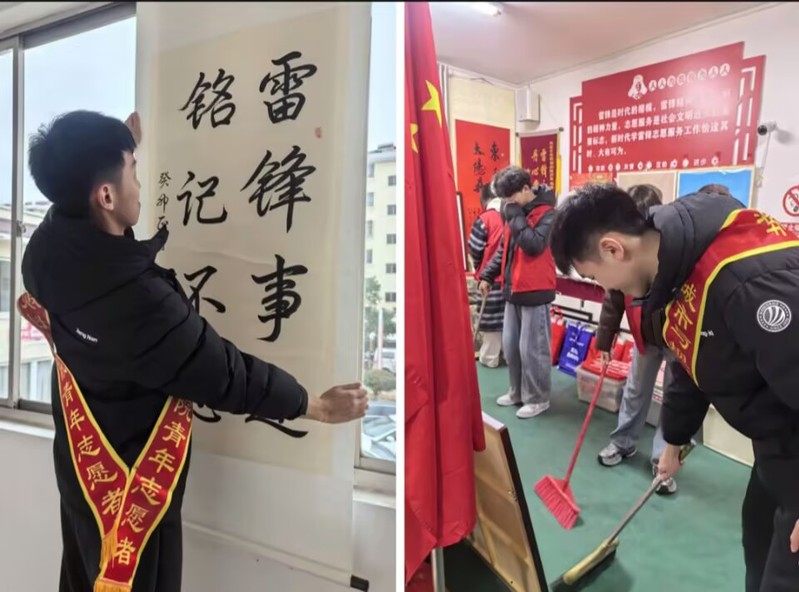 参观结束,志愿者们手持扫帚,细致打扫馆内地面,拂去浮尘,归置杂物,让文献馆焕然一新、整洁明亮。随后,一幅书写着“雷锋事迹 铭记不忘”的书法作品被悬挂于白墙之上。笔力遒劲,字字工整,凝结着对雷锋同志的深切缅怀,也承载着新时代青年的敬仰之心。
